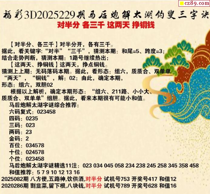 馬后炮解25年229期3d太湖釣叟之 對半分