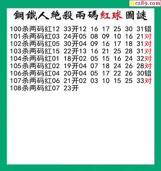 鋼鐵人殺兩碼紅球108期雙色球圖謎