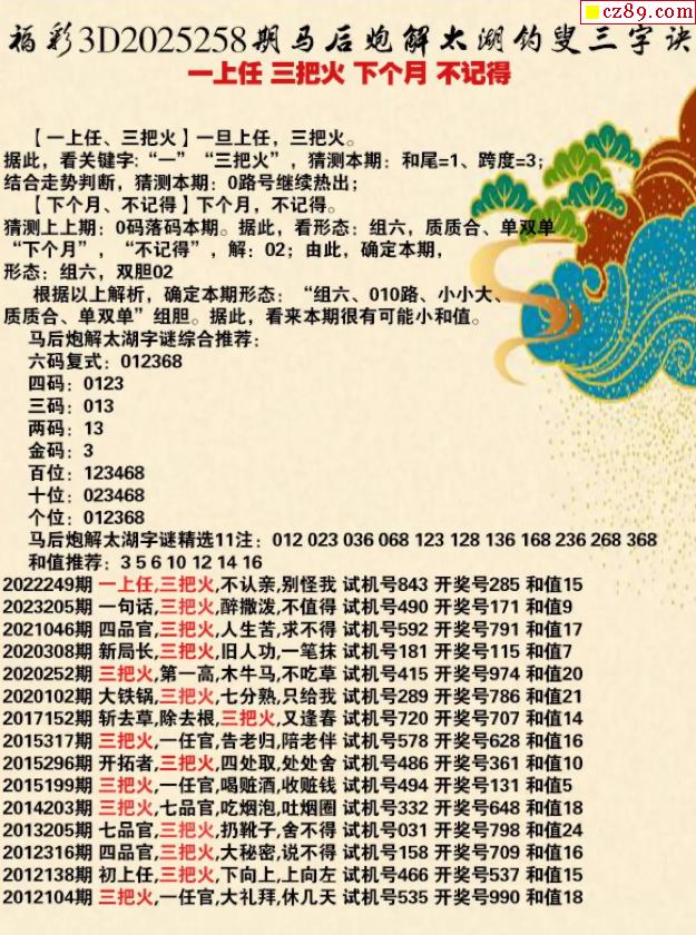 馬后炮解25年258期3d太湖釣叟之 一上任