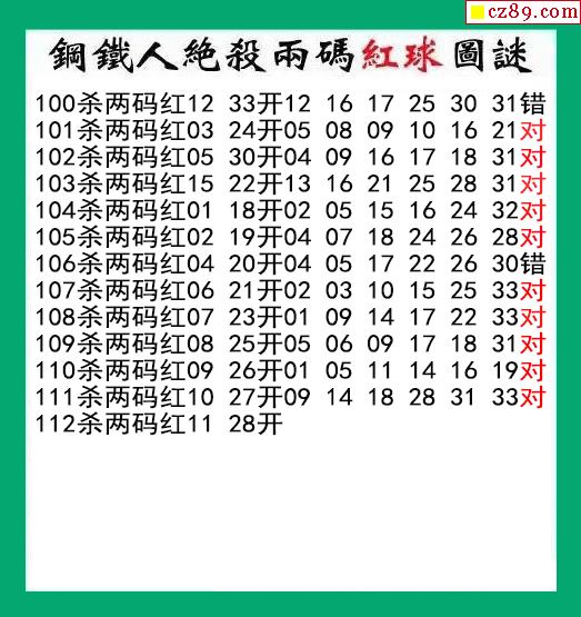 鋼鐵人殺兩碼紅球112期雙色球圖謎