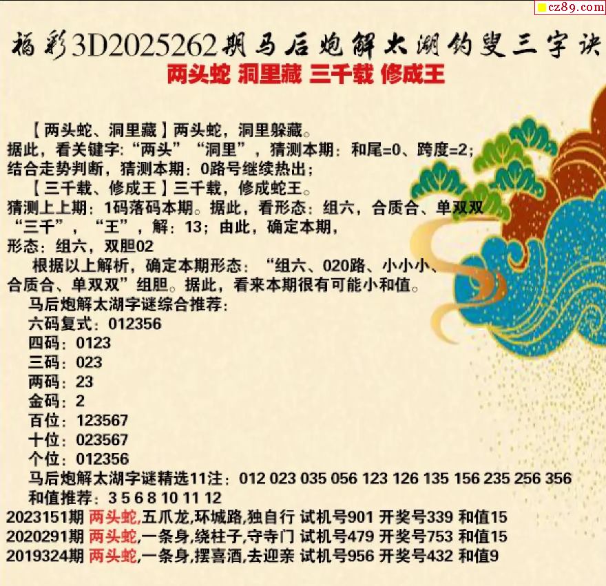 馬后炮解25年262期3d太湖釣叟之 兩頭蛇