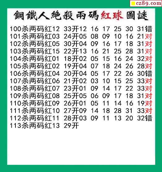 鋼鐵人殺兩碼紅球113期雙色球圖謎