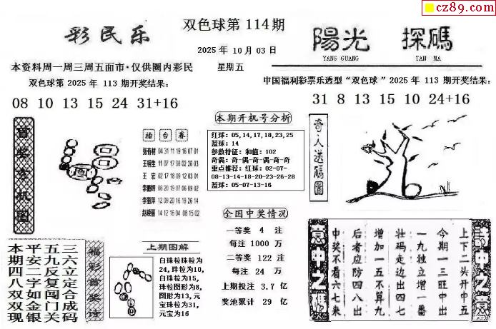 雙色球2025114期 彩民樂+陽光探碼圖文版