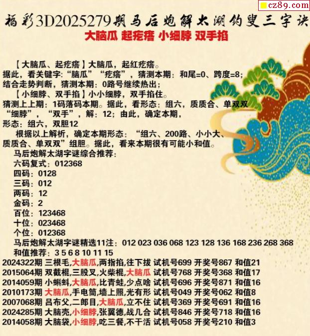 馬后炮解25年279期3d太湖釣叟之 大腦瓜