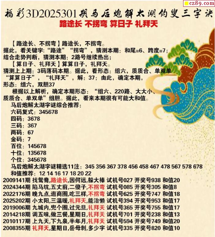 馬后炮解25年301期3d太湖釣叟之 路途長
