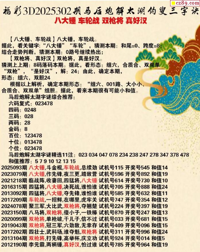 馬后炮解25年302期3d太湖釣叟之 八大錘