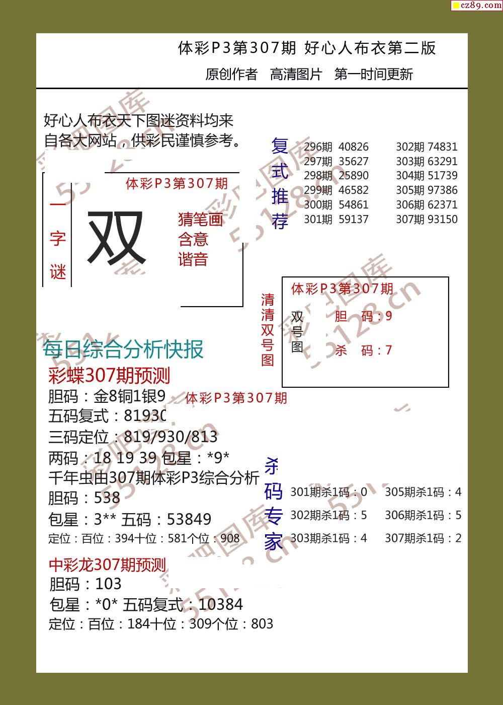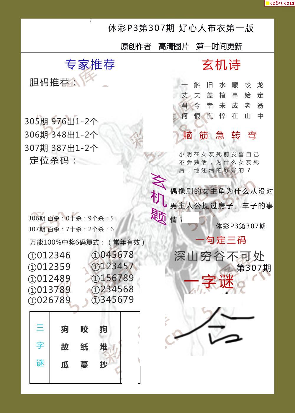 好心人布衣AB版307期體彩p3圖謎
