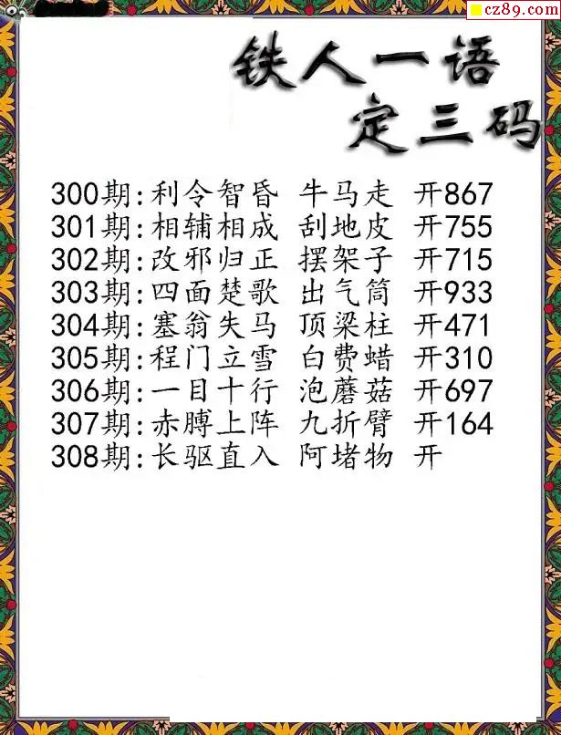 福彩3D2025308期鐵人一句定三碼字圖謎